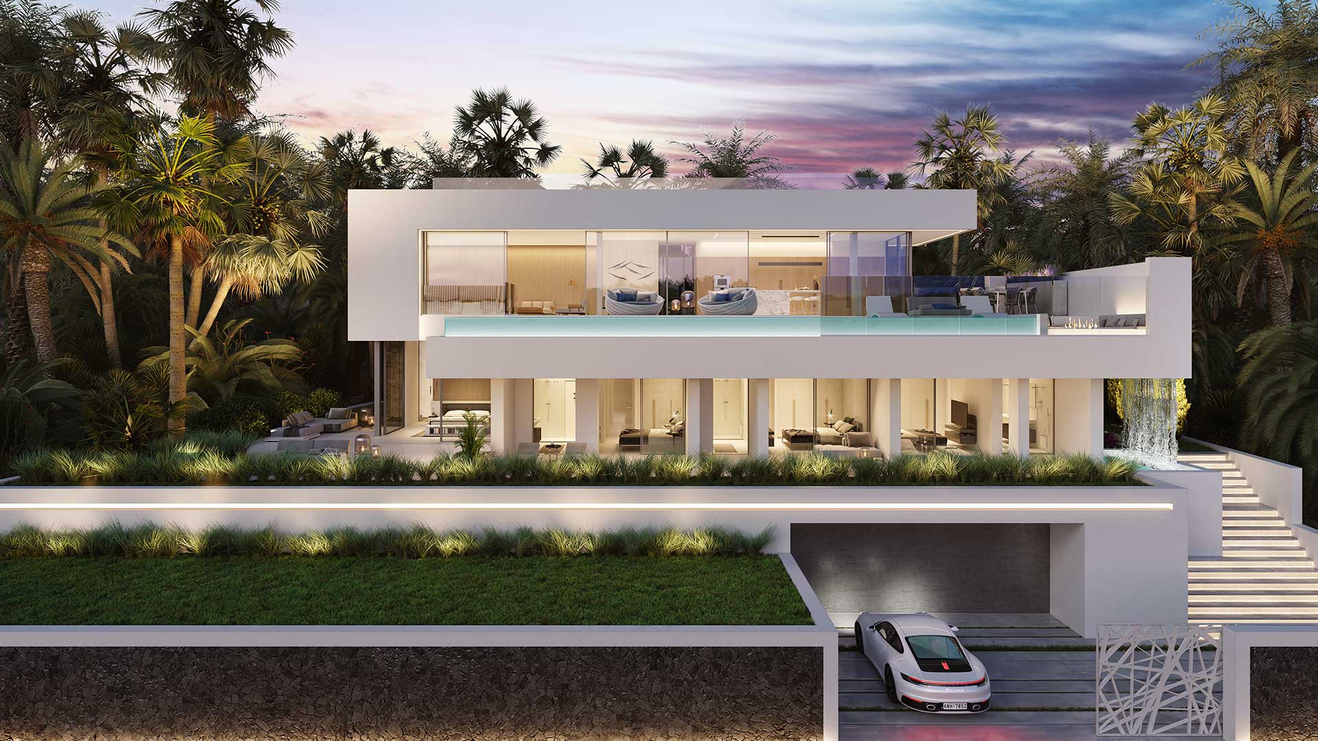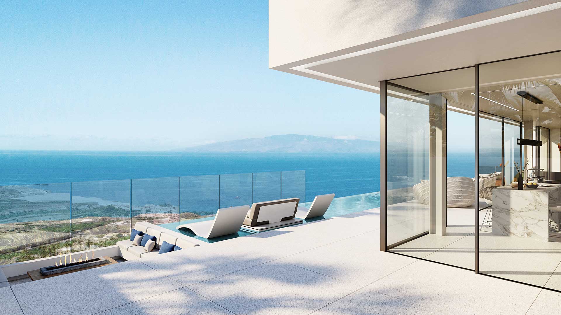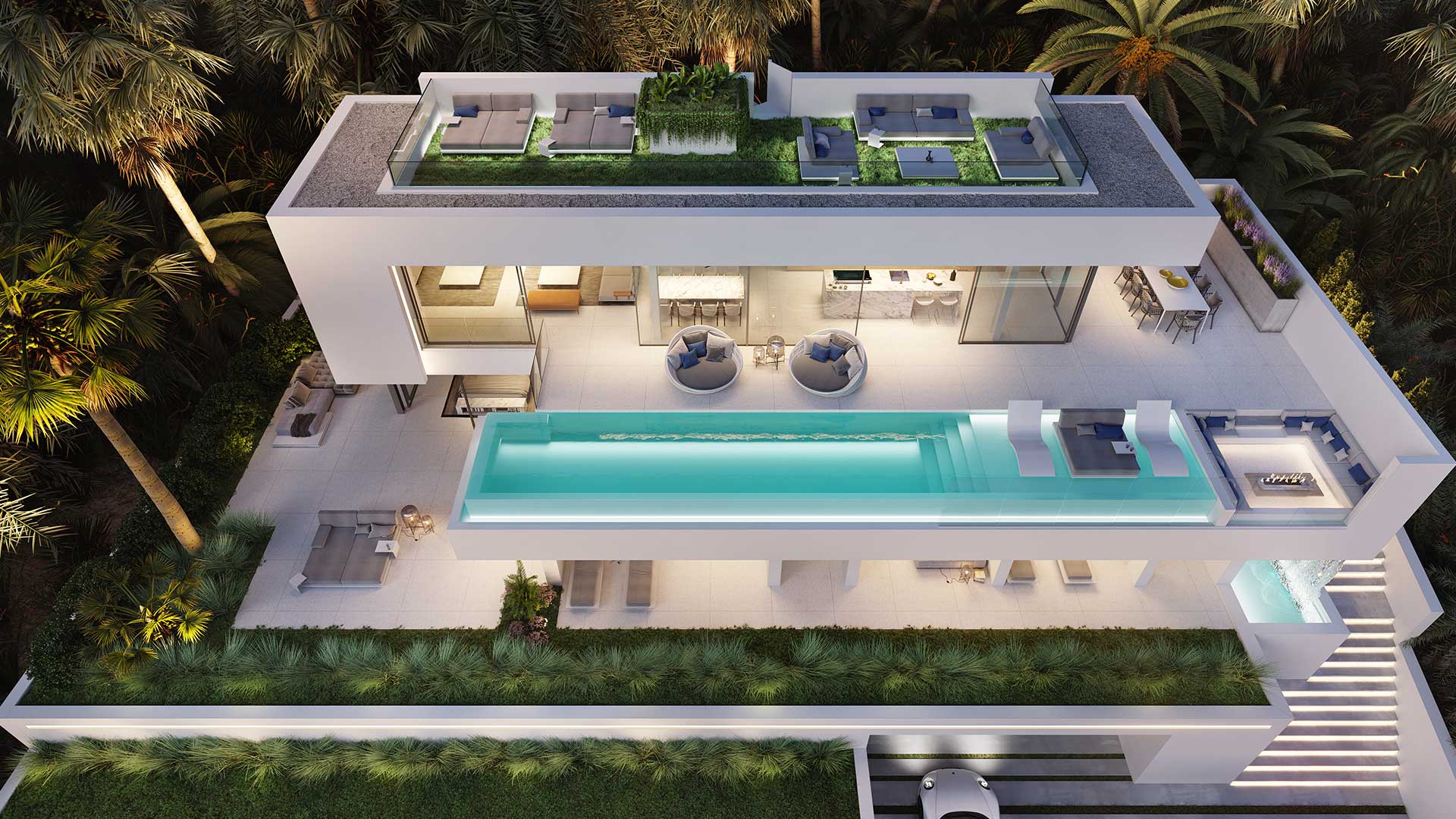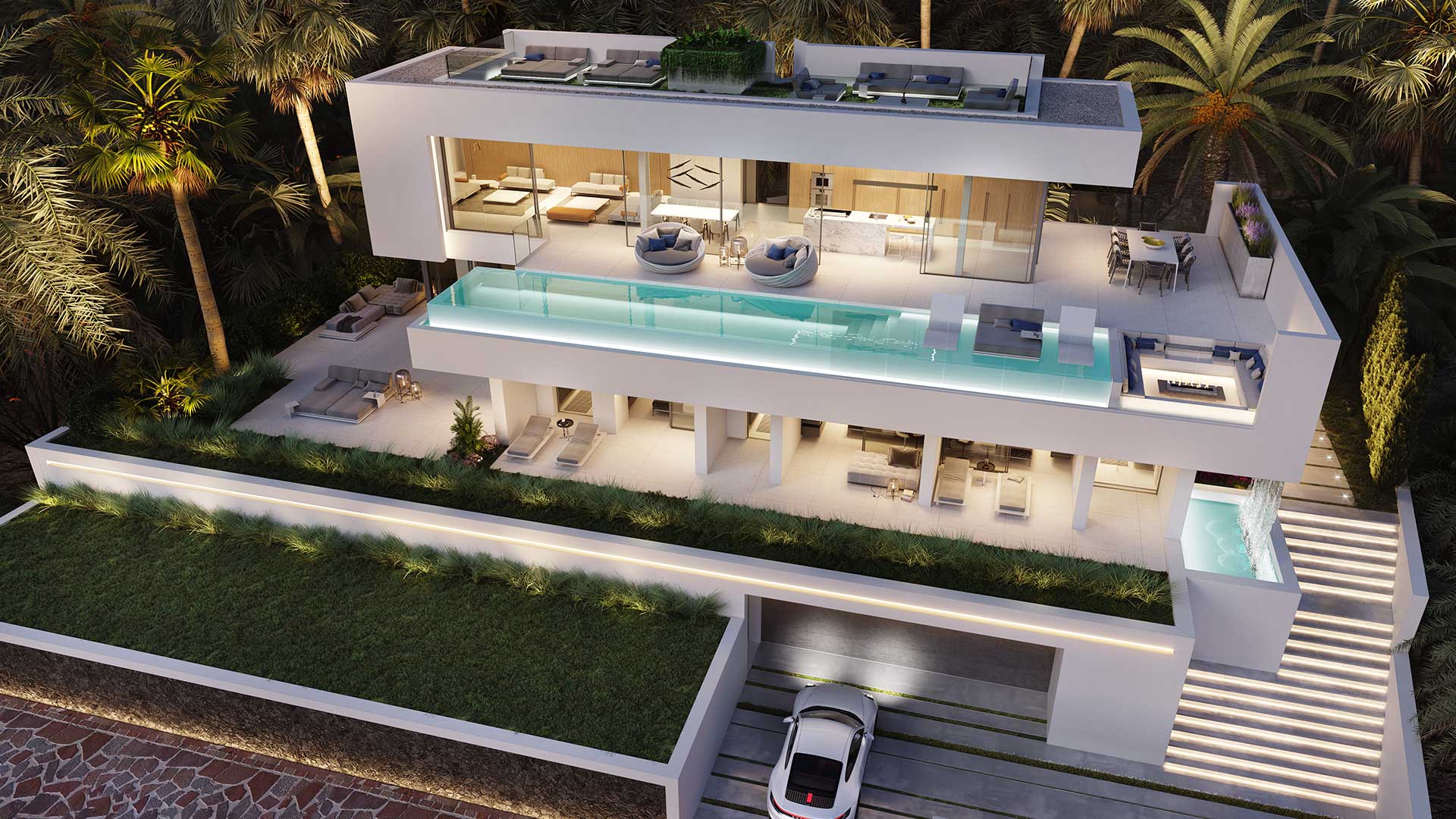 On the second floor, there is a long infinity pool with panoramic views, and the interior is furnished with elegant, minimalist furniture.