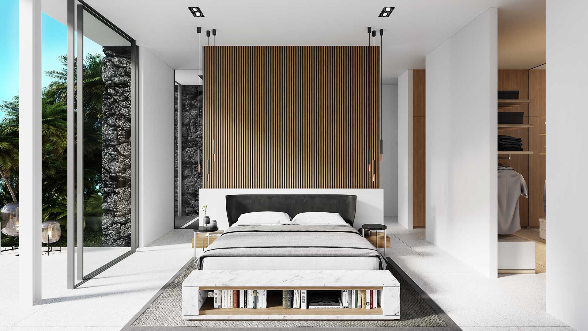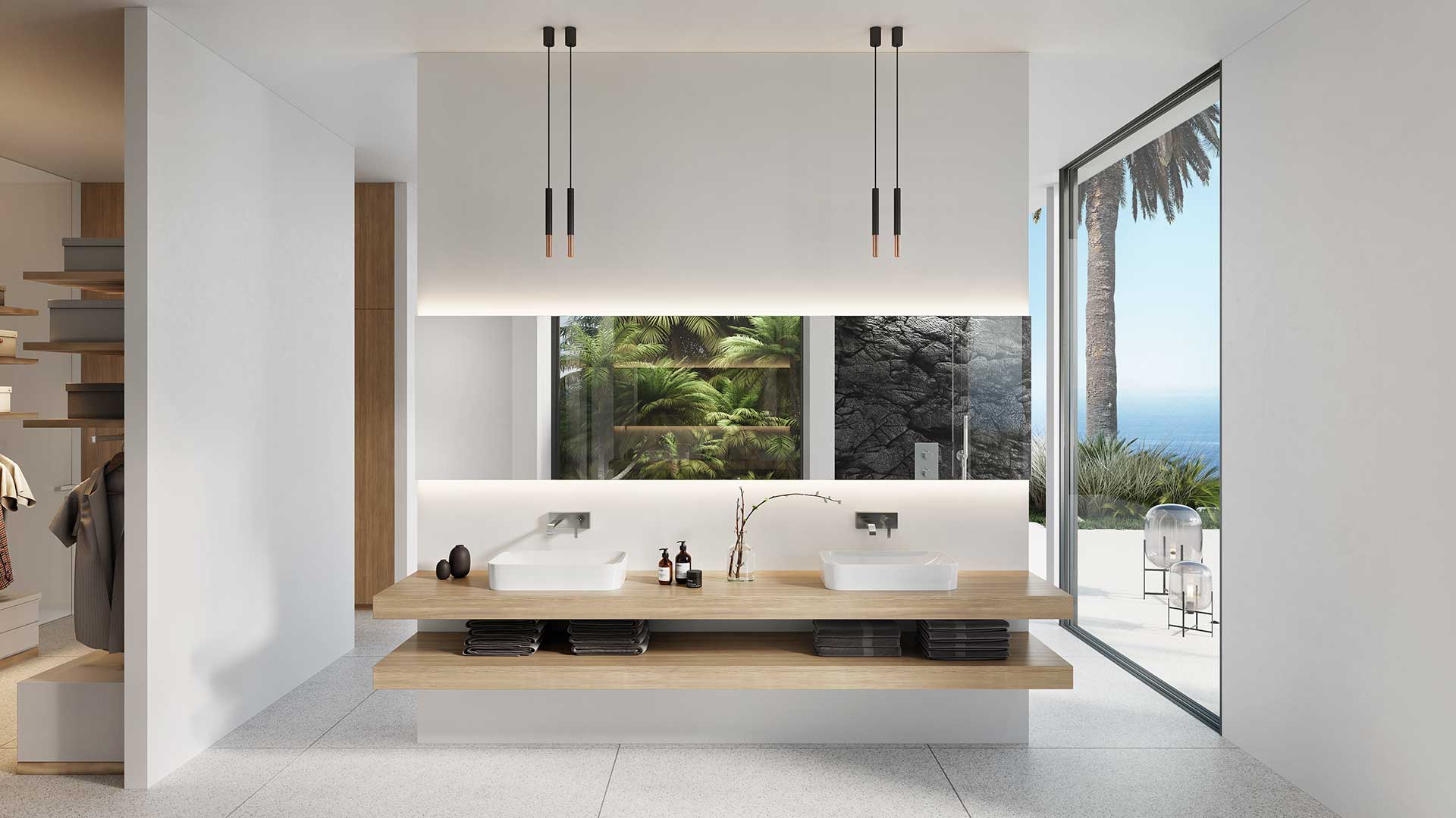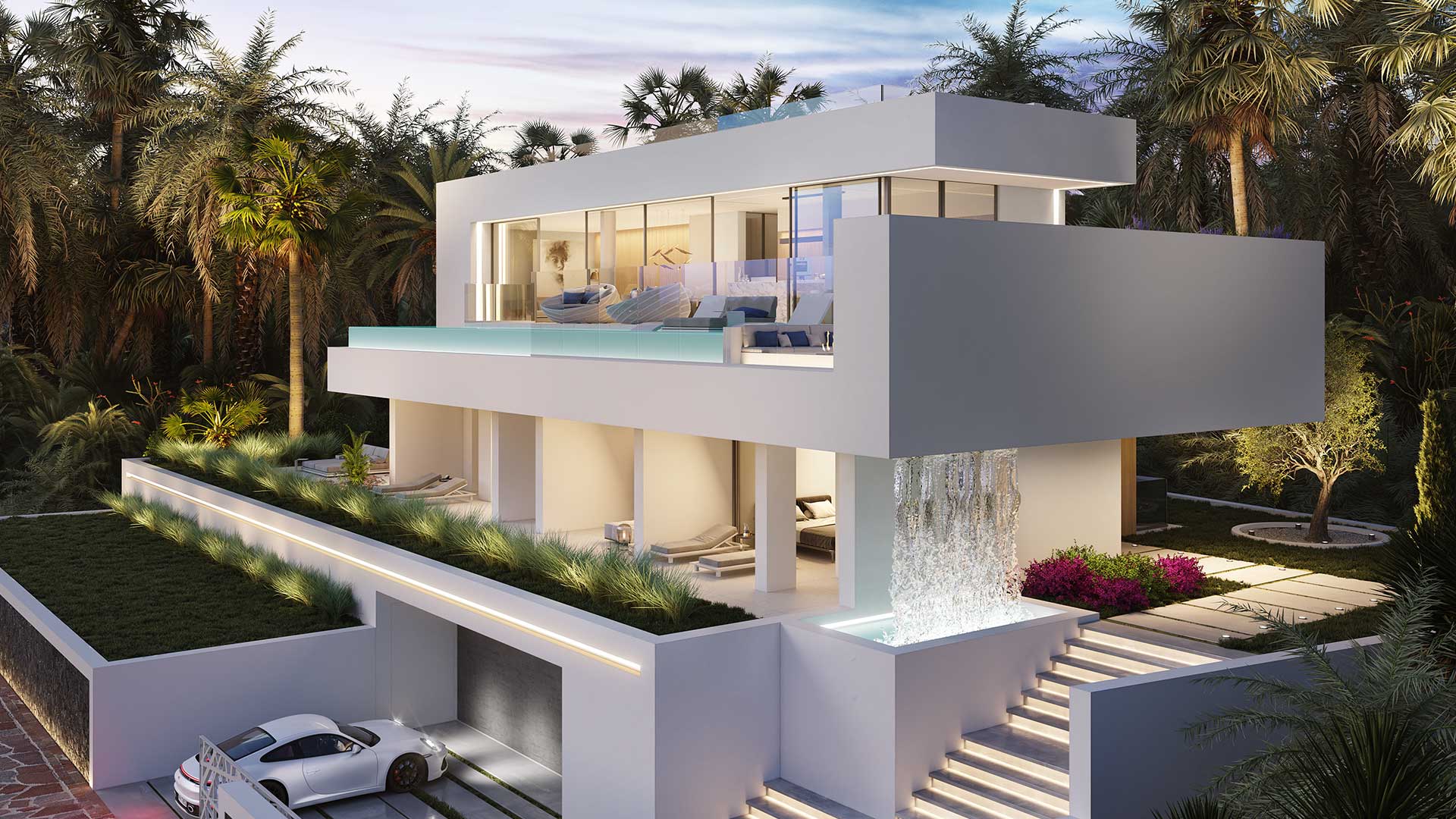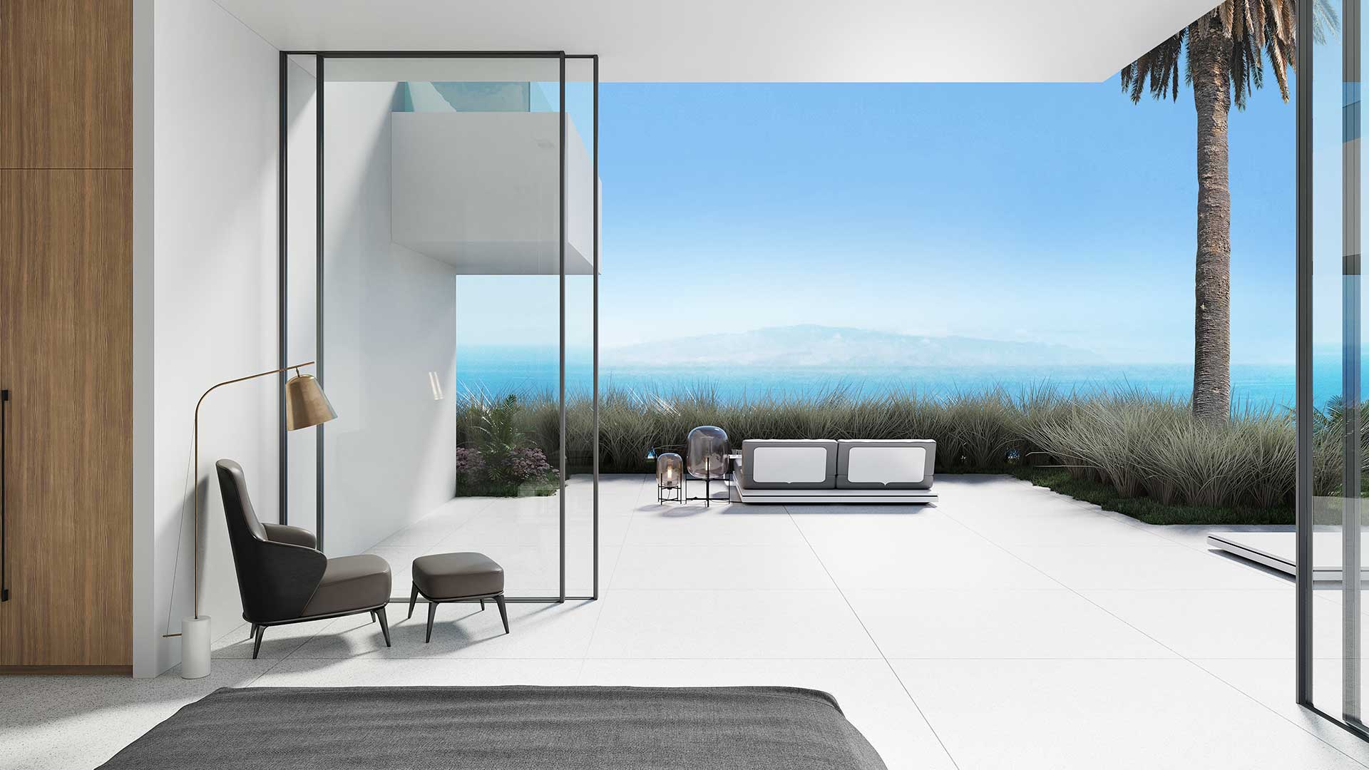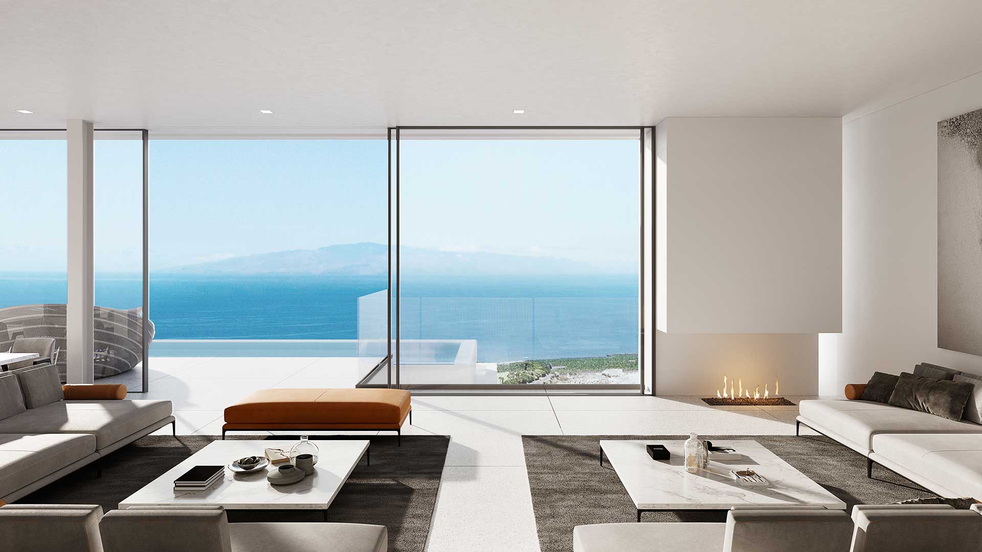 On the second floor, there is a long infinity pool with panoramic views, and the interior is furnished with elegant, minimalist furniture.