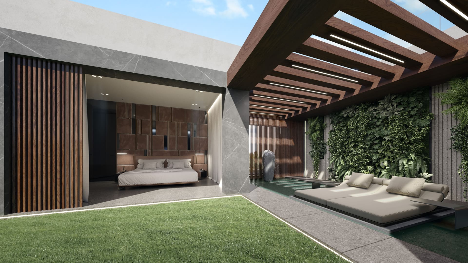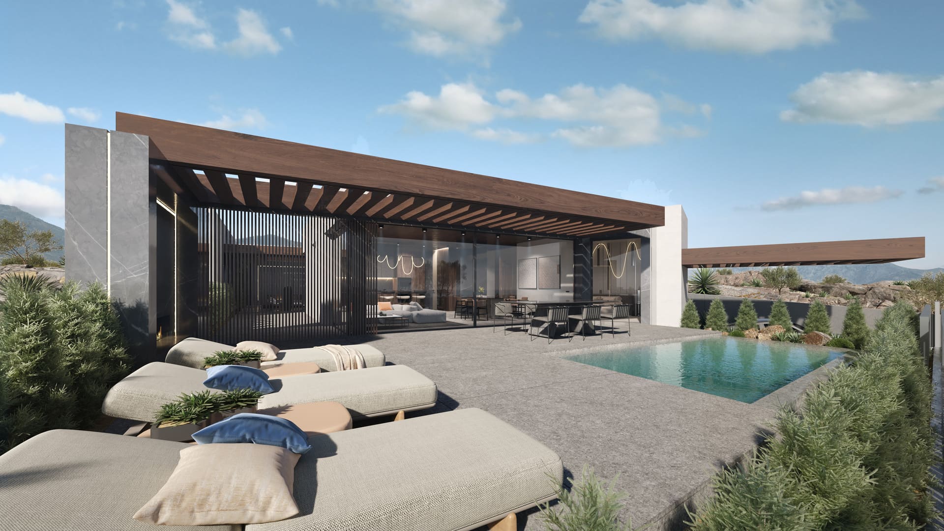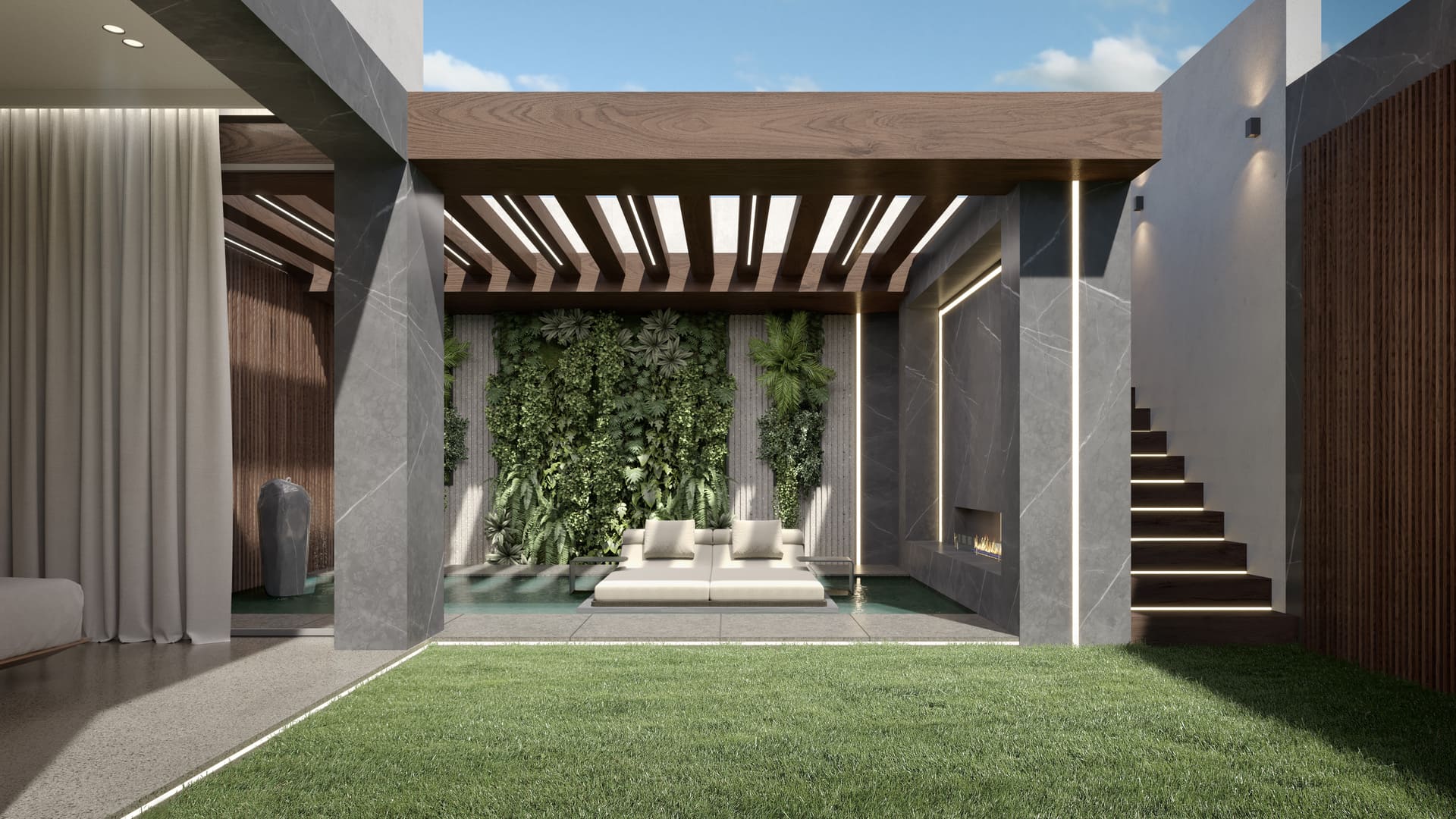 The play of light and shadow through the wooden pergolas emphasizes the home’s orientation to the sun, bringing a sense of rhythm and harmony.