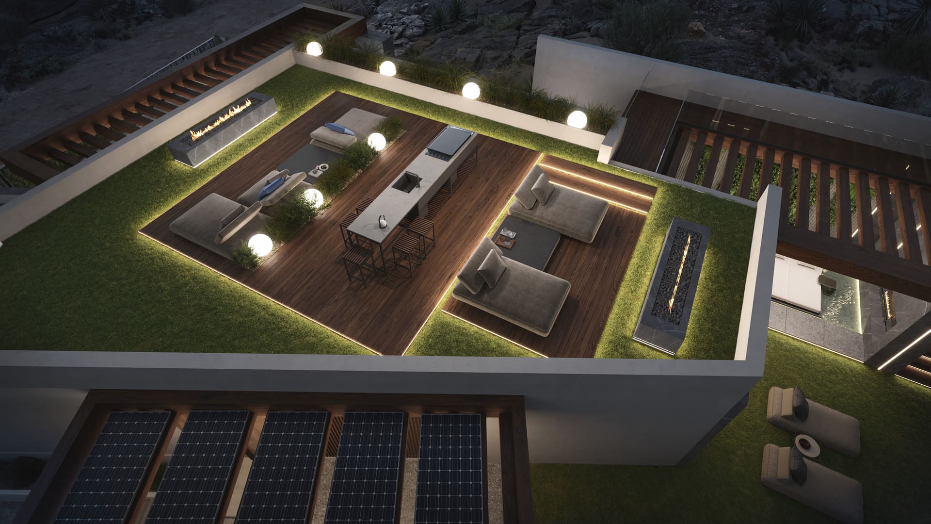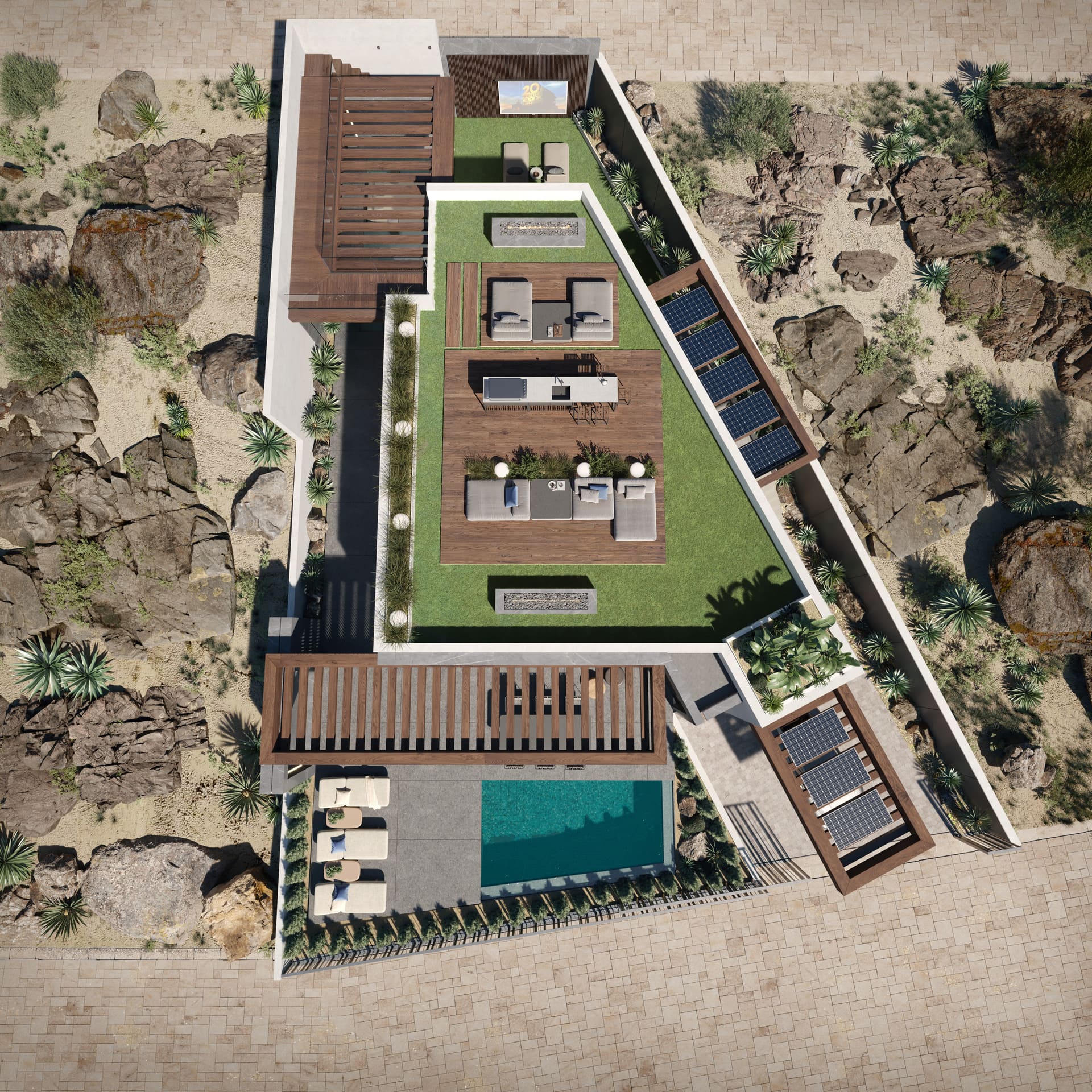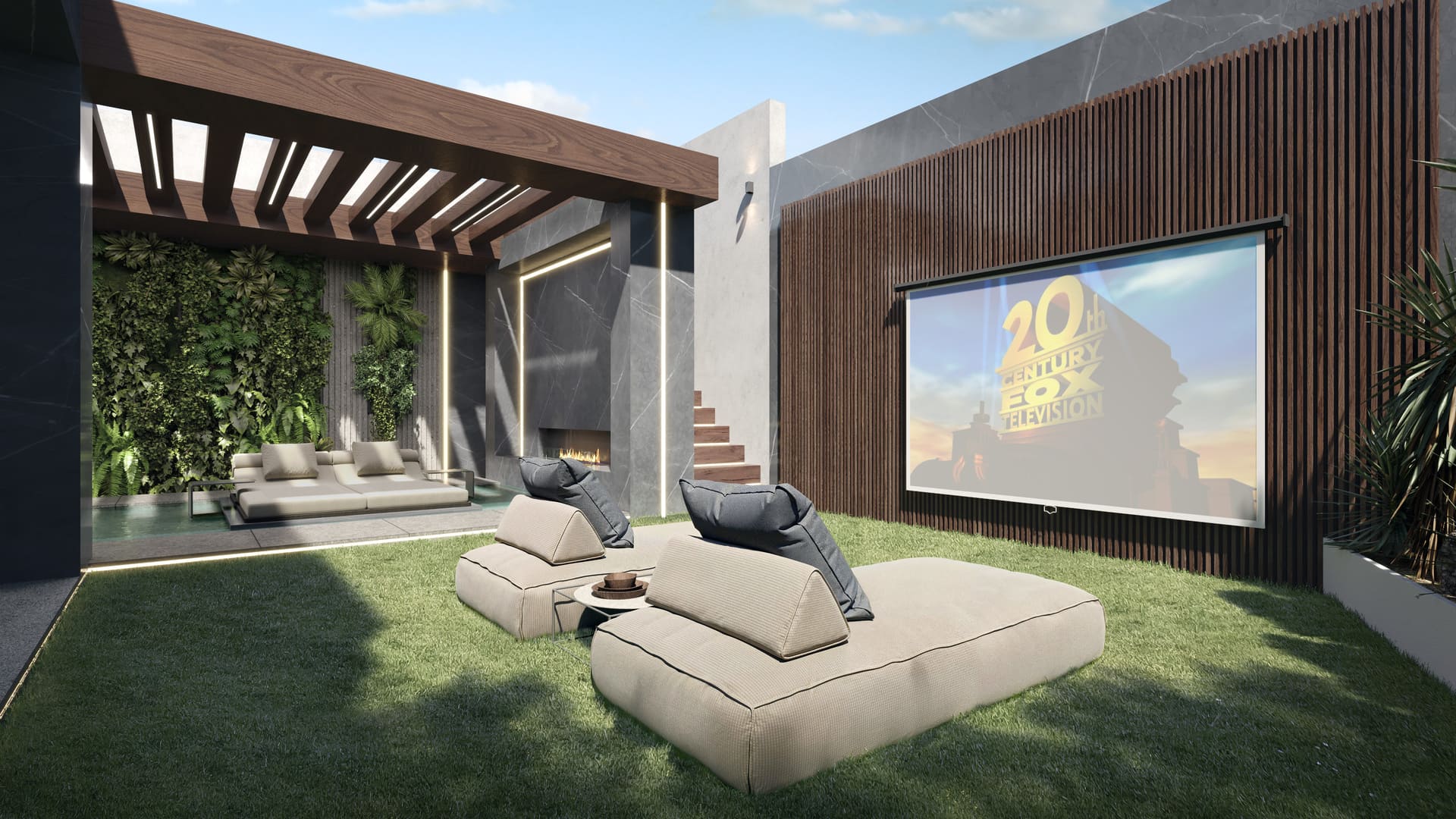 The play of light and shadow through the wooden pergolas emphasizes the home’s orientation to the sun, bringing a sense of rhythm and harmony.
