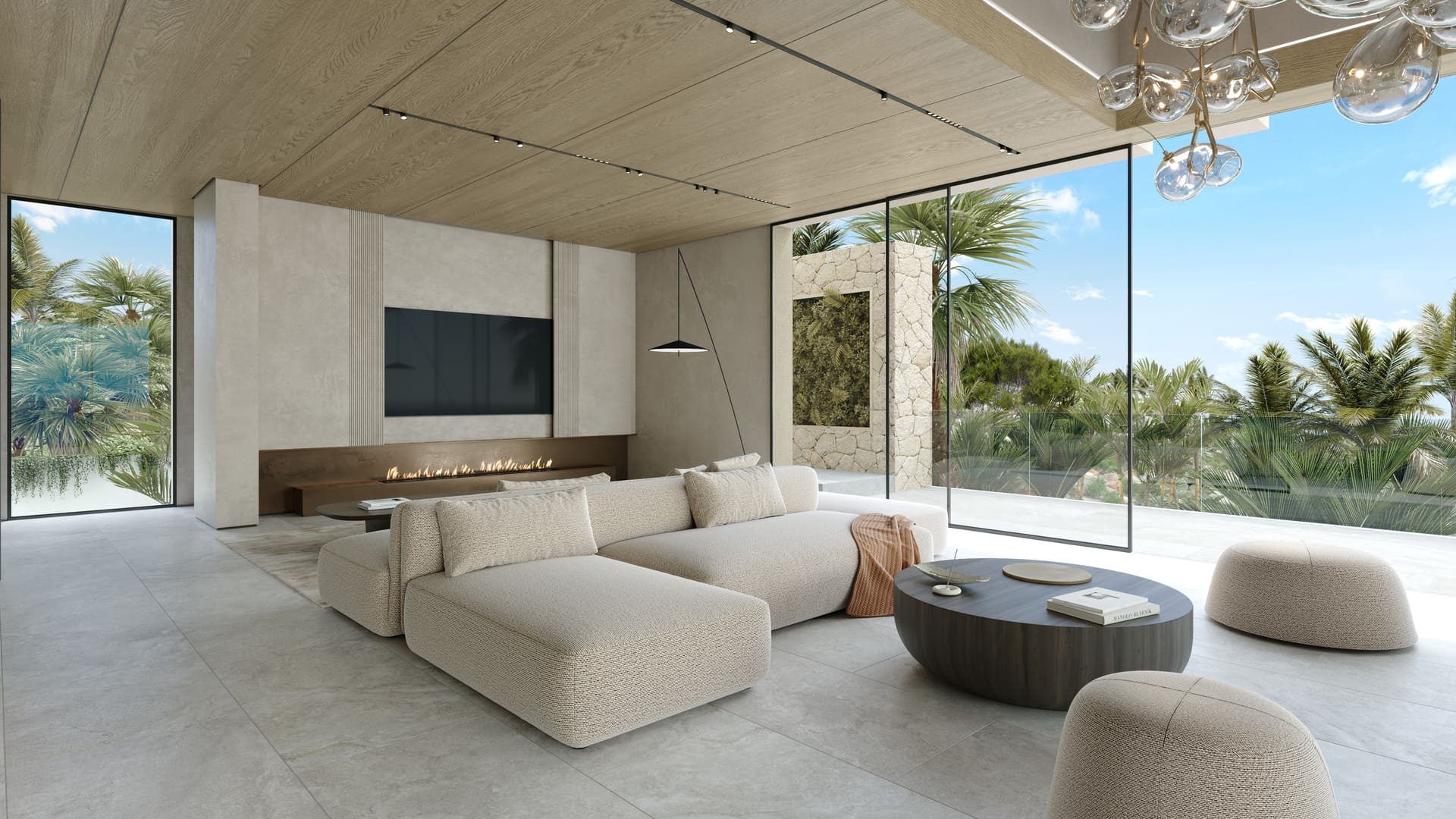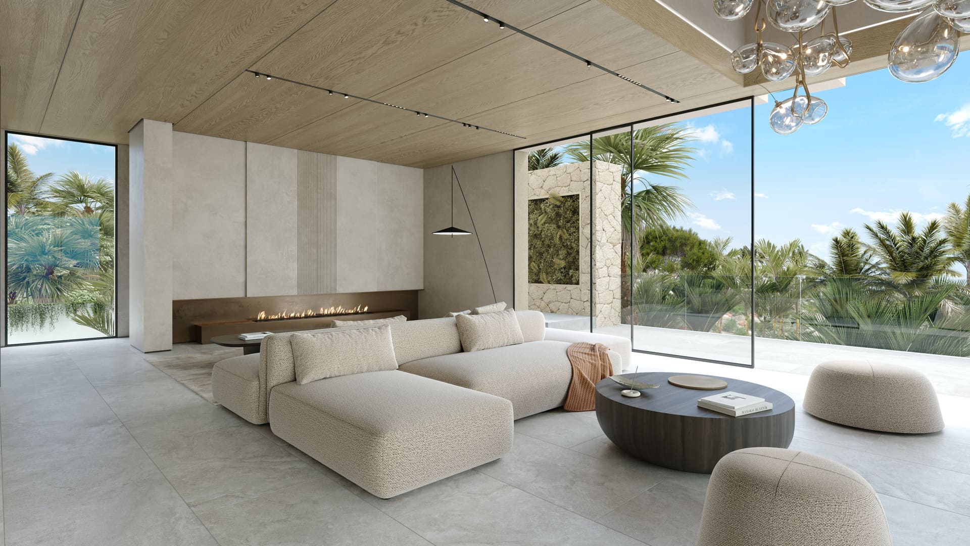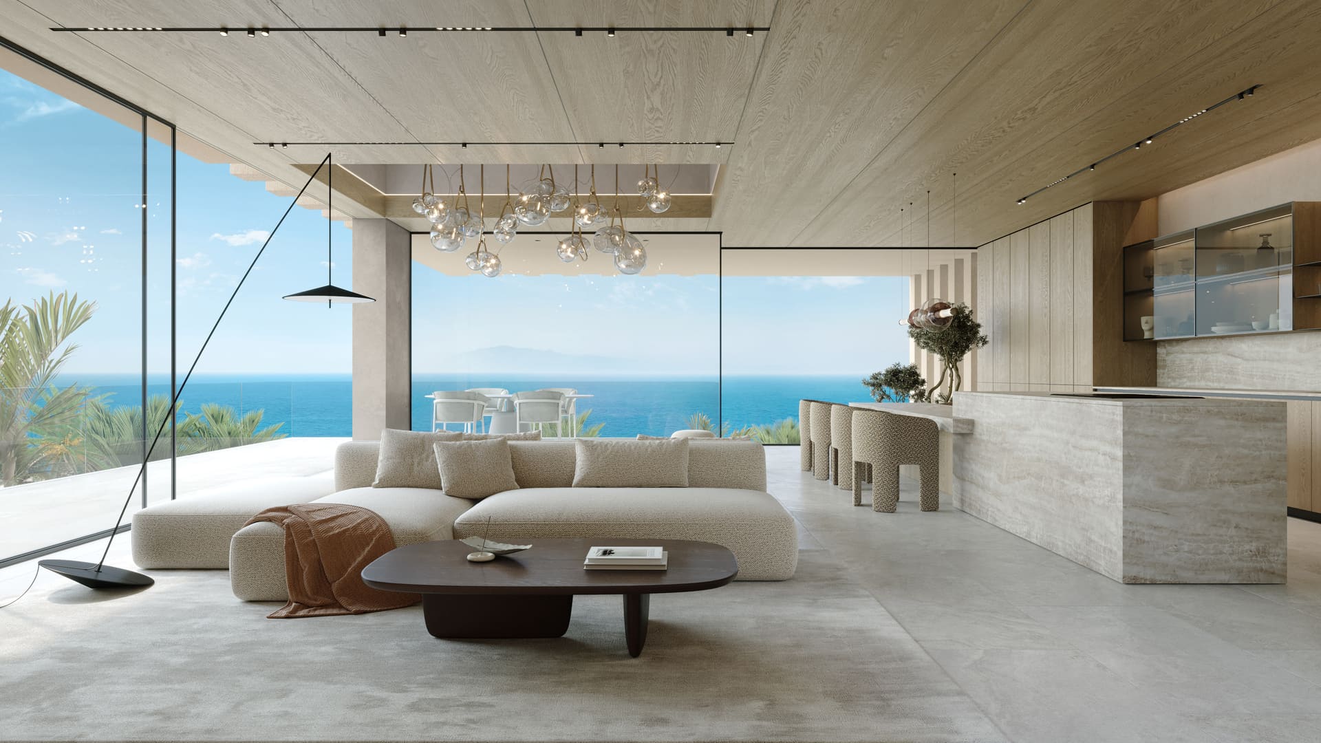 The style is deliberately minimalist and calm, with an emphasis on a restrained and harmonious aesthetic. Large windows and open spaces fill the home with natural light, while carefully selected materials and furnishings complete the atmosphere of unity with nature.